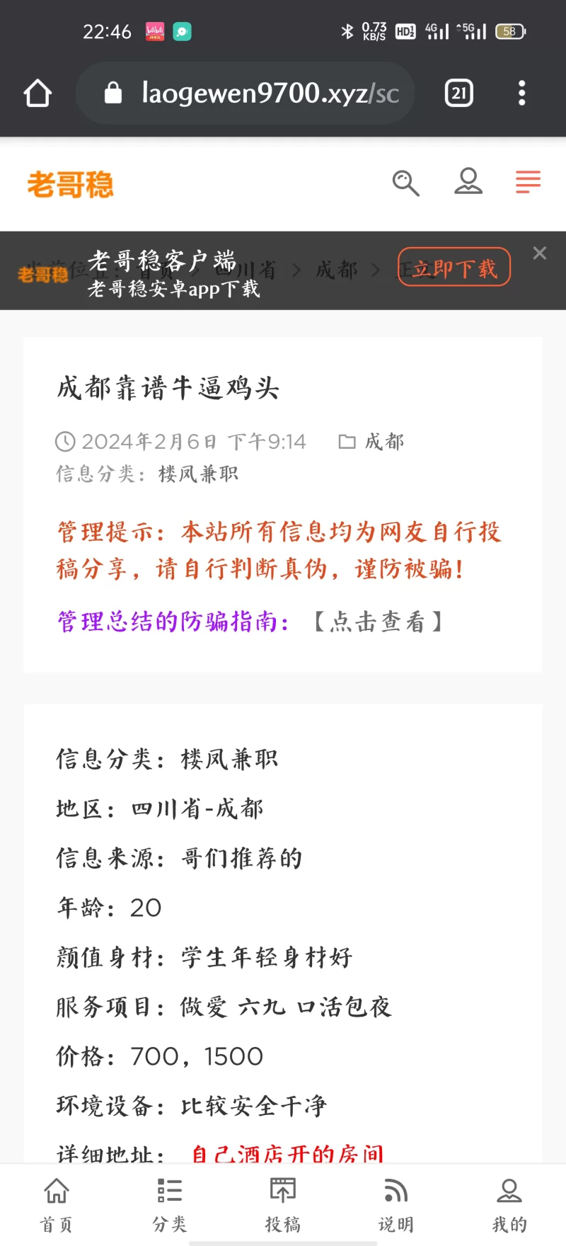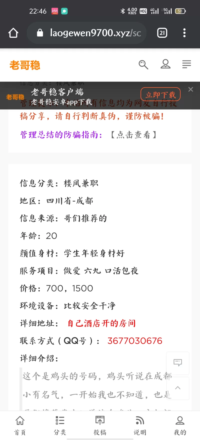 信息分类:骗子曝光 地区:四川省-成都 信息来源:老哥稳论坛 年龄:骗子 颜值身材:骗子 服务项目:骗子 价格:骗子 环境设备:骗子 详细地址: (管理提示:经用户举报,此信息有诈骗行为,请勿被骗!) 联系方式(QQ号): (管理提示:经用户举报,此信息有诈骗行为,请勿被骗!) 详细介绍: 一个装作鸡头的骗子,加上女的后会先让你给200定金,等开好酒店后,会让你继续赚钱,而且不给视频 骗子曝光