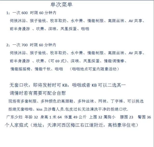 套餐3时限90分钟1000:伺候沐浴、牧羊取奶、水中箫、情趣制服、高跟丝袜、Av共享、前半身漫游、吹箫《可69式》凤凰探蛋、情趣调情棒、情趣摇摇椅、 情趣千秋吊床、啪啪( 啪啪地点可室内随意活动)