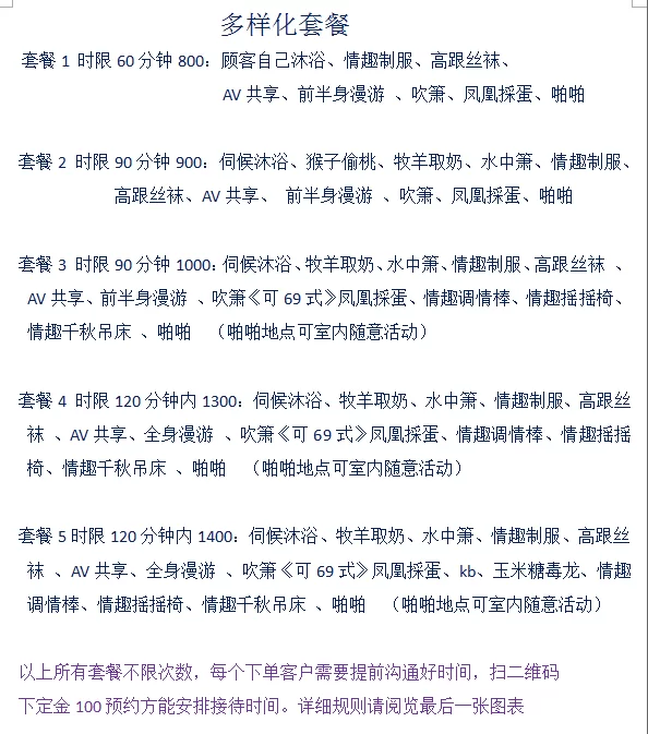套餐5时限120分钟内1400:伺候沐浴、牧羊取奶、水中箫、情趣制服、高跟丝袜、AVv共享、全身漫游、吹箫《可69式》凤凰探蛋、kb、玉米糖毒龙、情趣调情棒、情趣摇摇椅、情趣千秋吊床、啪啪(啪啪地点可室内随意活动)
